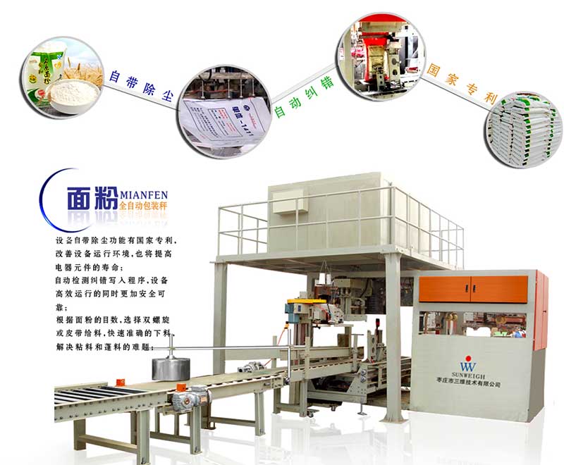 棗莊三維專業(yè)生產面粉全自動包裝秤,面粉全自動包裝秤主要由自動套袋機、稱重包裝設備、除塵機組、折邊縫口機、立袋輸送和PLC組成,其中粉料自動套袋機械手、粉狀物料精密包裝秤和除塵功能均有由公司申報的國家專利為技術支持,真正的解決了面粉包裝過程中粉塵大和包裝精度與速度的難題。