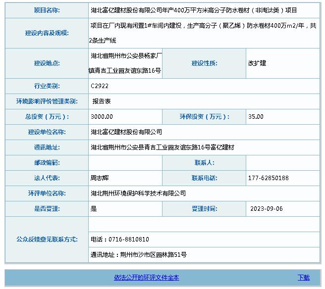 湖北富億建材股份有限公司年產(chǎn)400萬(wàn)平方米高分子防水卷材(非淘汰類)項(xiàng)目